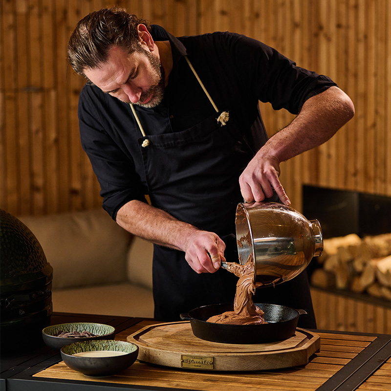 - Maak de skillet schoon, vet in met boter en schep het beslag in de skillet. Leg twee koude pizzastenen op elkaar op het rooster en plaats hier de skillet op; dankzij de dubbele pizzastenen zal de bodem van de moelleux niet verbranden. Sluit het deksel van de Big Green Egg en bak de moelleux ca. 25 minuten totdat de buitenkant gestold is. Haal de skillet uit de kamado en laat de chocolademoelleux in de skillet afkoelen.