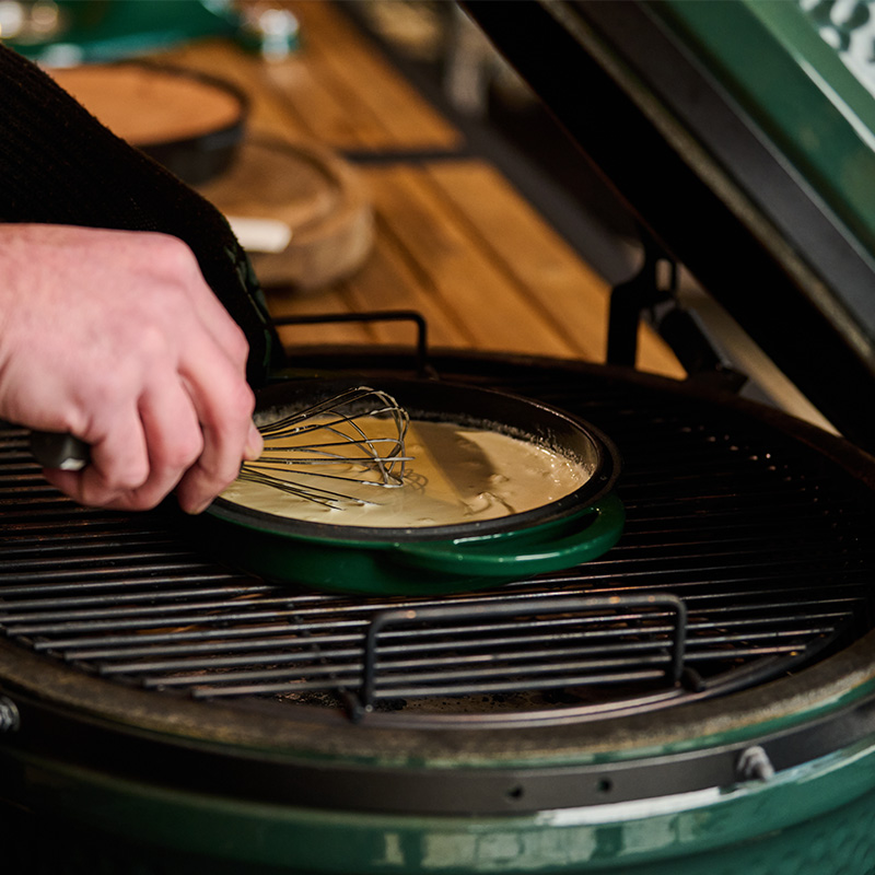- Plaats de skillet (Ø 27 cm) op het rooster. Voeg de boter toe, sluit het deksel van de kamado en laat de boter smelten.