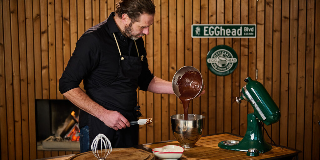 - Haal de skillet uit de Big Green Egg, voeg de chocolade aan de gesmolten boter toe en roer tot een egaal mengsel. Klop het eiwit met de rest van de suiker in een standmixer luchtig.