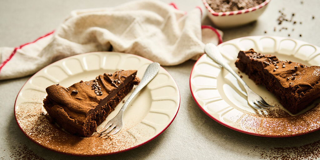 - Schenk het hete slagroommengsel bij de chocolade en roer door zodat er een egaal mengsel ontstaat. Schenk de ganache over de afgekoelde moelleux. Bestuif met behulp van een zeefje met cacaopoeder en bestrooi met cacaonibs.