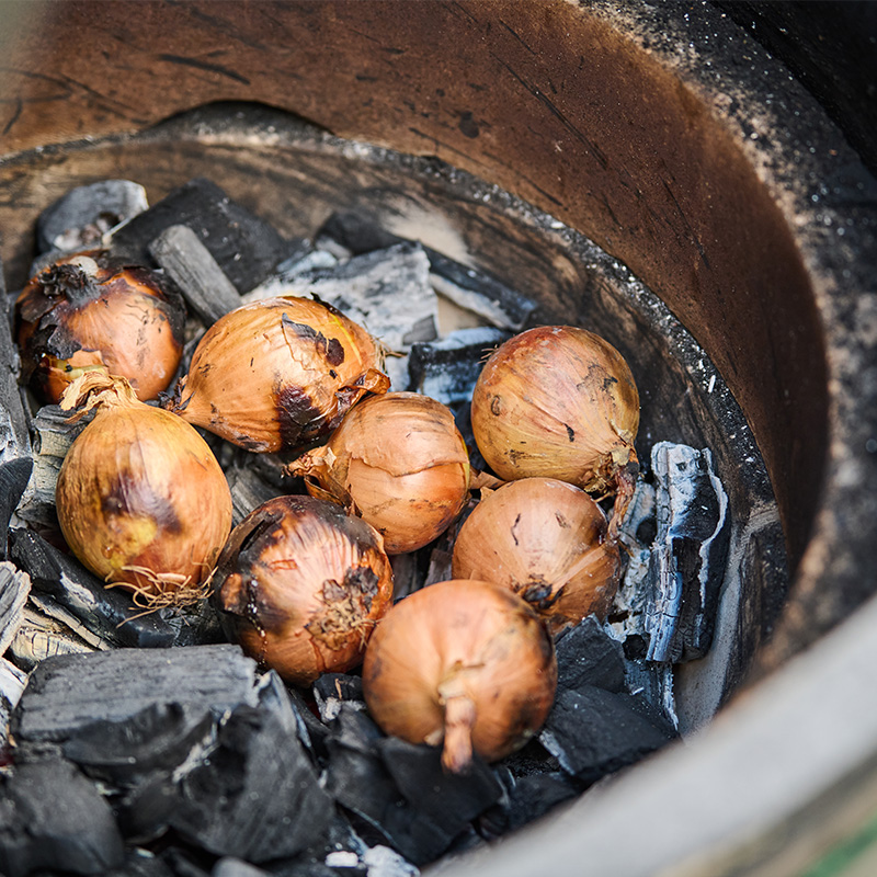 - Placez les oignons sur les braises et fermez le couvercle du Big Green Egg. Faites rôtir les oignons pendant environ 20 minutes en les retournant à mi-cuisson.