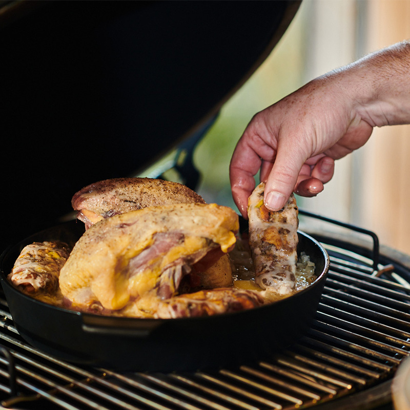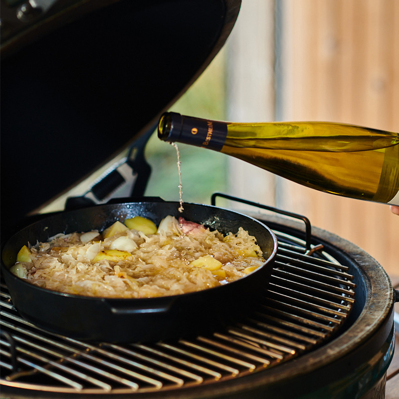 - For the sauerkraut, peel and chop the onion. Cut the cured pork belly into cubes of about 1 centimetre. Peel and slice the potatoes. Melt the goose fat in the skillet. Add the onion, bacon and potatoes and fry until the onion is translucent. Ladle occasionally and close the lid of the kamado after each action. Meanwhile, briefly rinse the sauerkraut in a colander under the cold tap and drain.