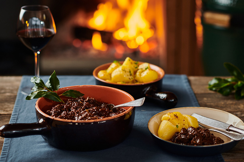 - Take the Dutch oven out the EGG, remove the grid and insert the heat shield. Put the grid back in place. Put the pan back on and close the lid of the EGG. Raise the temperature to 140°C. Let the hash stew for 2½-3 hours until the meat is nice and tender.