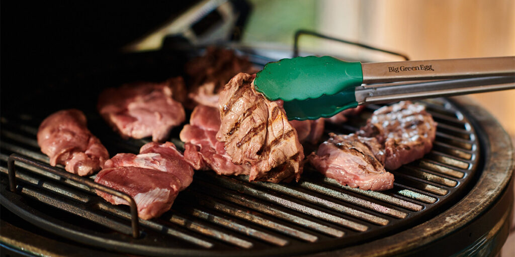 - Place the wild boar neck steaks on the grid and grill for about 2 minutes. Turn the steaks a quarter turn and grill for another 2 minutes. Turn the steaks over and grill again for 2 x 2 minutes. Close the lid of the kamado after each action.