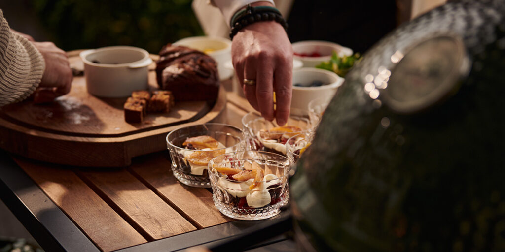 Pidätkö klassisesta englantilaisesta triflestä? Siinä tapauksessa tämä Big Green Eggin 2.0-versio karamellisoidulla päärynällä ja banaanileivällä on pakko lisätä ruokalistallesi. Voit valmistaa kaikki komponentit kamadollasi etukäteen. Grillaa päärynä mieluiten päivää aiemmin, jotta sokerisiirappi ehtii imeytyä päärynään kunnolla. Voit halutessasi koota tämän jälkiruoan jopa muutamaa tuntia etukäteen. Näin tarjoilet tämän jälkiruoan hetkessä.