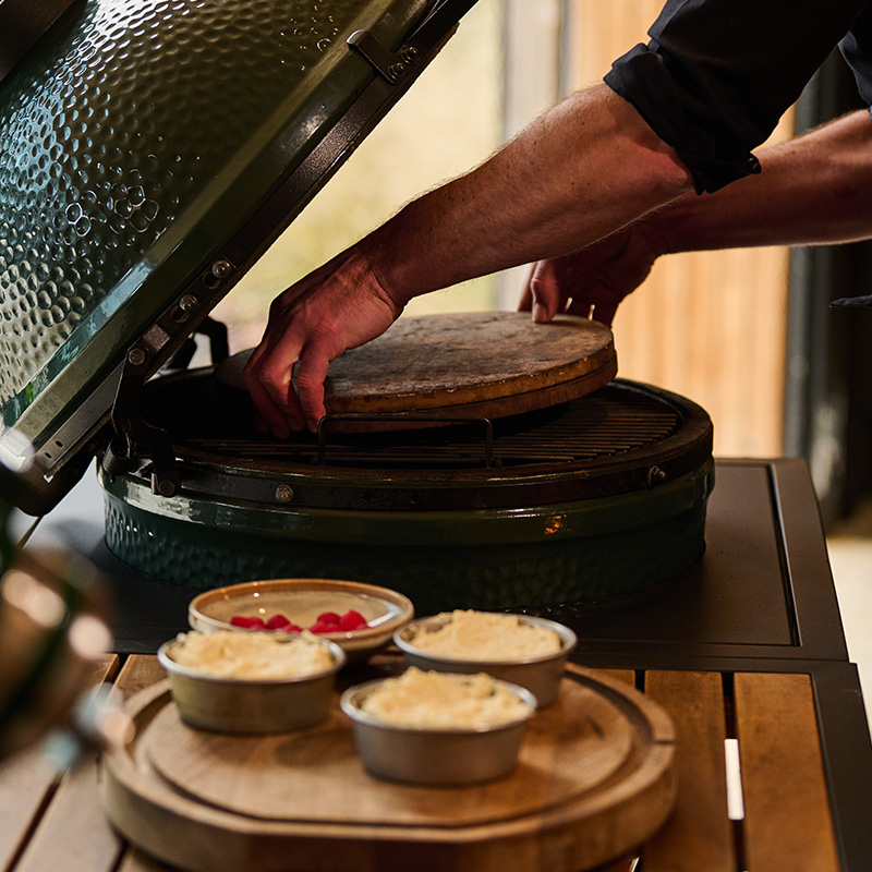 - Retirez les moules du Big Green Egg et déposez les petits cakes aux amandes sur le torchon posé sur la grille. Laissez refroidir et garnissez de framboises supplémentaires avant de servir.