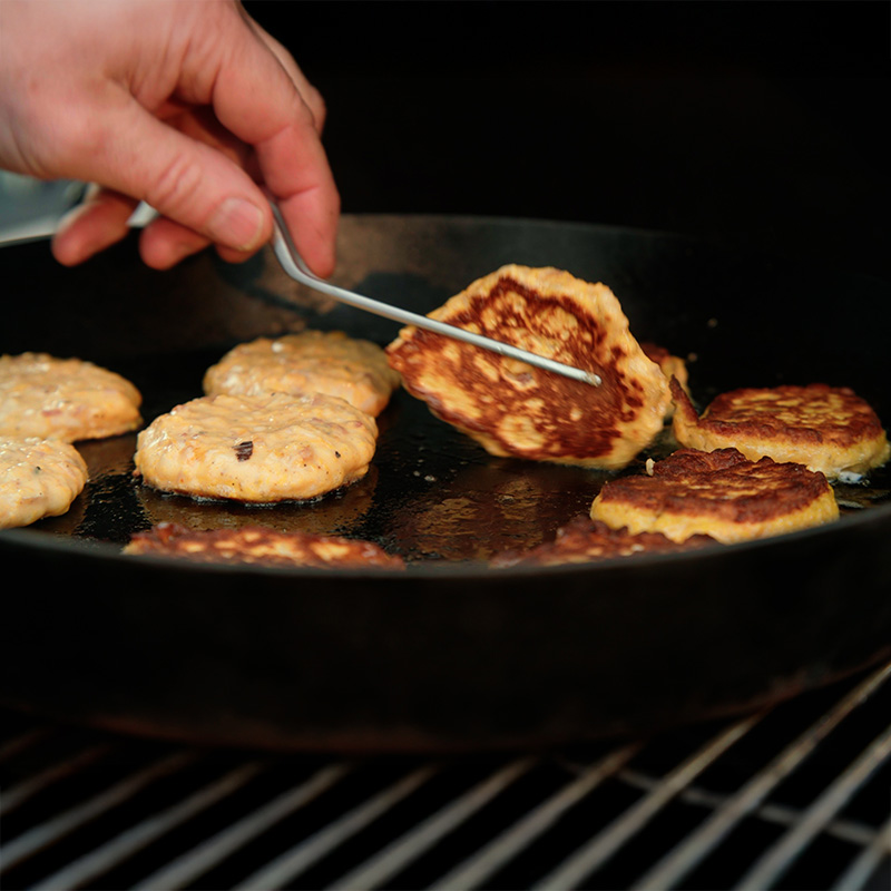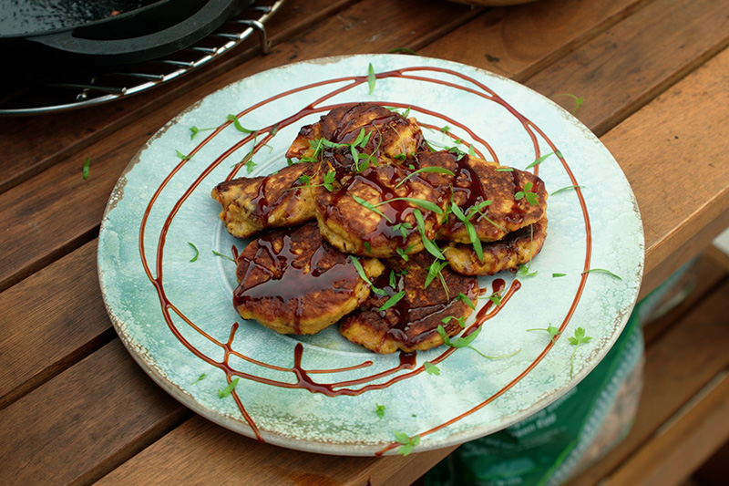 5. Verhit de 4 eetlepels olijfolie in de skillet. Voeg met voldoende tussenruimte volle eetlepels van het beslag toe. Sluit de deksel van de kamado en bak de pancakes 2-3 minuten totdat ze mooi goudbruin zijn. Keer de pancakes om en bak nogmaals 2-3 minuten.
