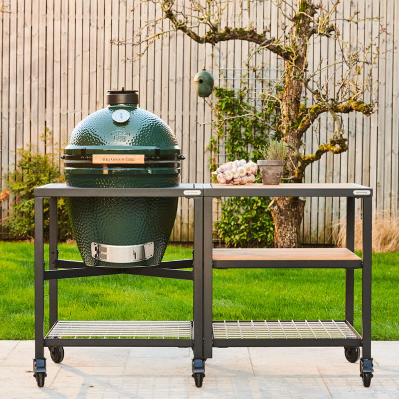 Wil je het jezelf makkelijk maken? Stel dan je eigen Big Green Egg buitenkeuken samen op basis van de Modular EGG Workspace. Een modulair systeem dat je eindeloos kunt uitbreiden op basis van verschillende modules. Je kunt ze naar eigen smaak kunt customizen met behulp van diverse inserts. De basis bestaat uit een EGG Frame of Corner EGG Frame, dé basis om je kamado in te plaatsen. Vanuit die basis bouw je verder, door bijvoorbeeld een Expansion Frame en/ of een Expansion Cabinet aan het EGG Frame te koppelen. Hiermee kun je deze kant-en-klare buitenkeuken eindeloos uitbreiden. In een rechte of een hoekopstelling. Wil je een mobiele buitenkeuken? Dan bevestig je simpelweg bijpassende zwenkwielen onder de frames.