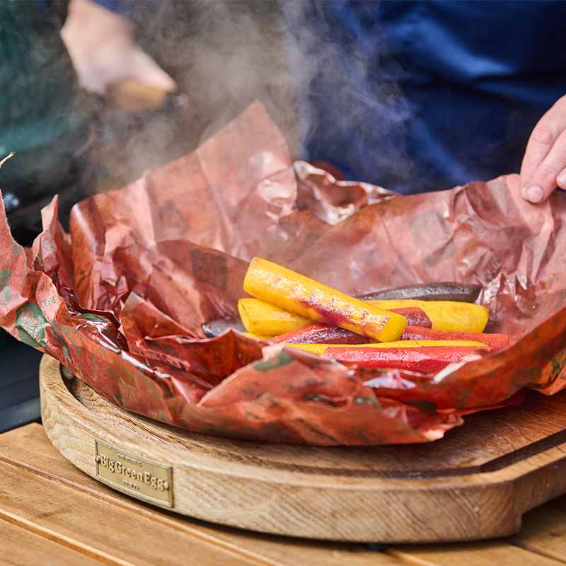 4. Kavrulmuş havuçları kamadodan çıkarın ve biraz soğumaları için paketleri dikkatlice açın. Izgarayı ve ısı kalkanını çıkarın ve dökme demir ızgarayı Big Green Egg’in üzerine yerleştirin. Kapağı kapatın, sıcaklığı 220°C’ye yükseltin ve ızgarayı yaklaşık 10 dakika önceden ısıtın.
